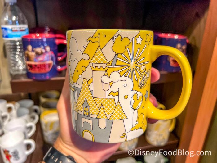 This yellow Disney parks mug will brighten up your morning! It’s made of ceramic and has images from the Disney theme parks all around. The mug holds about 14 oz.