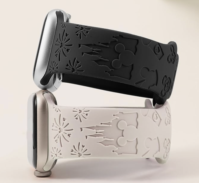 These Apple Watch bands feature cartoon images of Cinderella Castle, fireworks, and Disney theme park snacks. They’re made of silicone and fit several different series of Apple Watches.