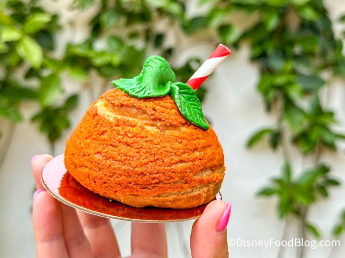 We tried 12 of the limited-time snacks. If you’re looking to grab something sweet, try this Orange Bird Sundae at Swirls on the Water. This is made with DOLE Whip Orange in a vanilla waffle bowl with whipped cream, green sprinkles, and an Orange Bird chocolate decoration. It only costs $6.49. The dole whip was light, bright, and tart, and since it was a tad icy rather than creamy, the whipped cream went really well with it. The waffle bowl was tasty, as well.