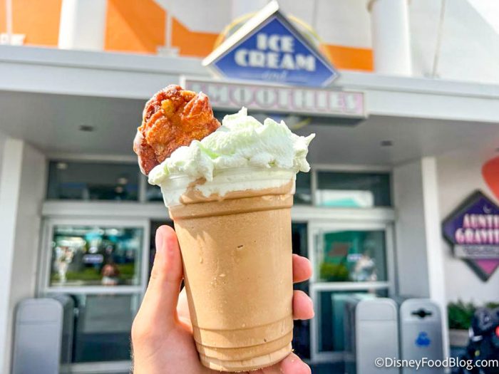 Did Disney just create A CHICKEN NUGGET MILKSHAKE?! We hate to break this to you, but no. Sadly, while the Pickle Shake exists at EPCOT, Disney World did NOT make a chicken nugget milkshake for us to try, but your eyes might trick you into thinking that’s what this is!