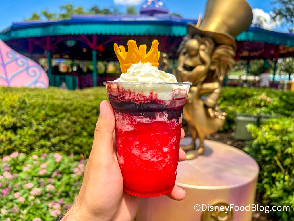 You can now grab the Queen of Hearts Slushy over at the Cheshire Cafe in Fantasyland for $5.99. This is a frozen cherry slushy drizzled with black cherry purée and topped with whipped cream and a crown-shaped chocolate piece.