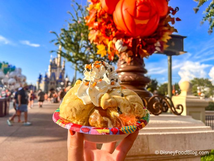 The Apple Fritter Sundae features apple fritters topped with your choice of ice cream, whipped cream, and sprinkles and costs $8.29. We chose to get pumpkin ice cream as our flavor to stick with the fall theme of the treat.