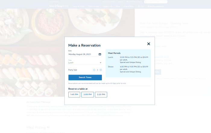 Shiki-Sai: Sushi Izakaya is now OPEN at EPCOT’s Japan Pavilion, but just for walk-ins. Reservations are available for dates starting on August 28th, 2023 and we couldn’t be more excited to check it out. And now, we are one step closer to trying this new table service spot — dining reservations are open!