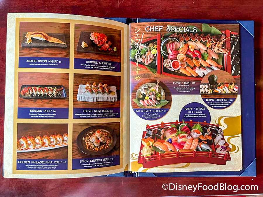 - Funamori — sashimi and sushi arranged on a boat-shaped platter (Disney notes that this is “served with the festive pomp and the boat procession of the famous Tenjin Matsuri”)