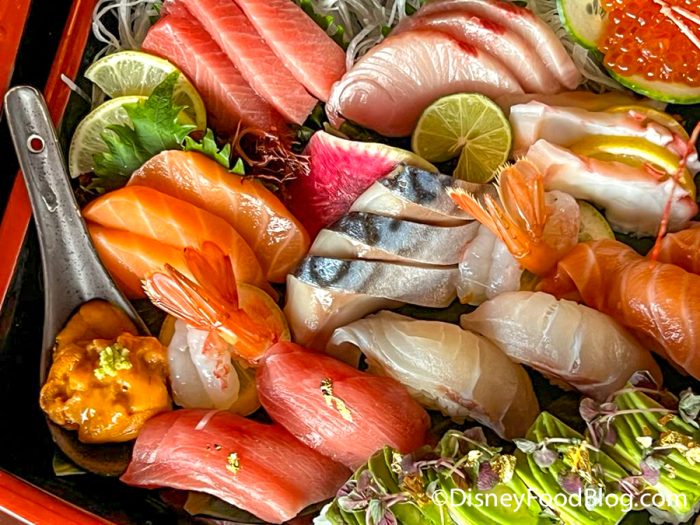 This is the $300 Fune — an assortment of sushi and sashimi that feeds 4-6 people. Honestly, the entire boat was incredible. It was easily some of the best sushi we’ve EVER had in Disney World. Yeah, it’s THAT good.