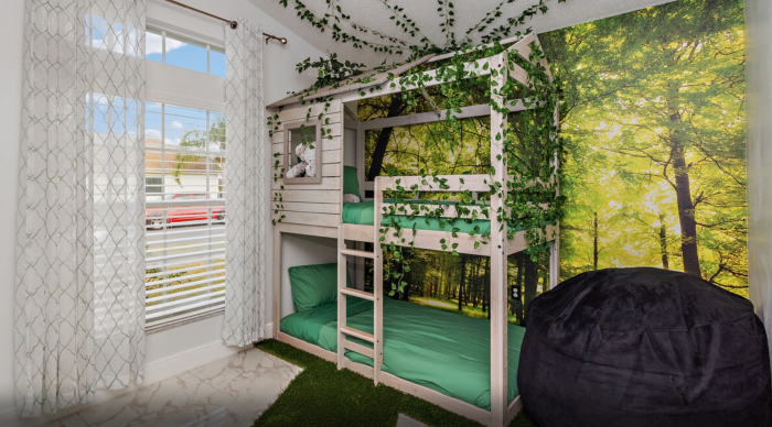 Check out this bedroom. It has bunk beds covered in ivy, a forest mural on the wall, and even turf carpet. This is perfect for younger kids.