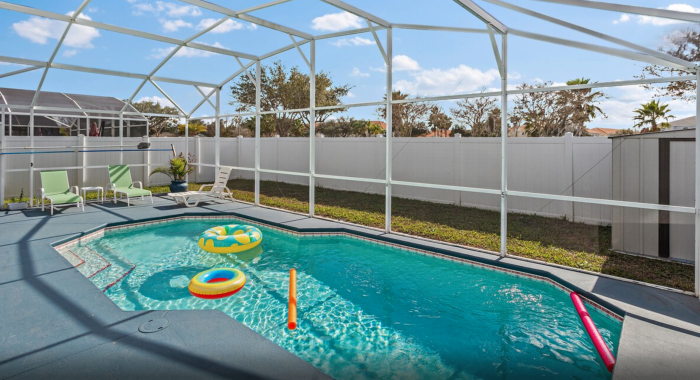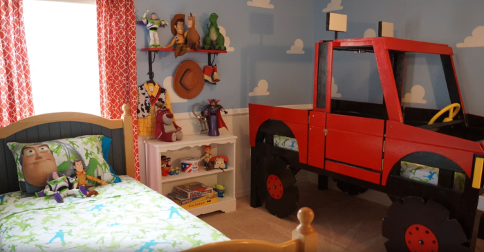 Up next, “Family Retreat” is just 5 minutes from Disney and has some great themed bedrooms. The home has 6 bedrooms and 4 bathrooms. It also has an outdoor pool available for guests to enjoy. Look at this Toy Story room is adorable complete with Buzz, Woody, and the gang.