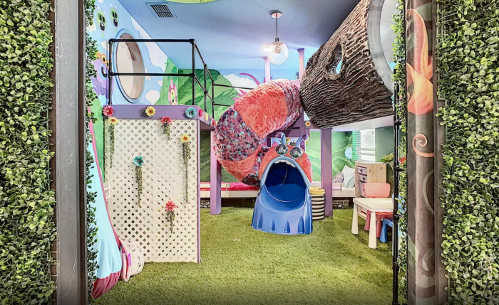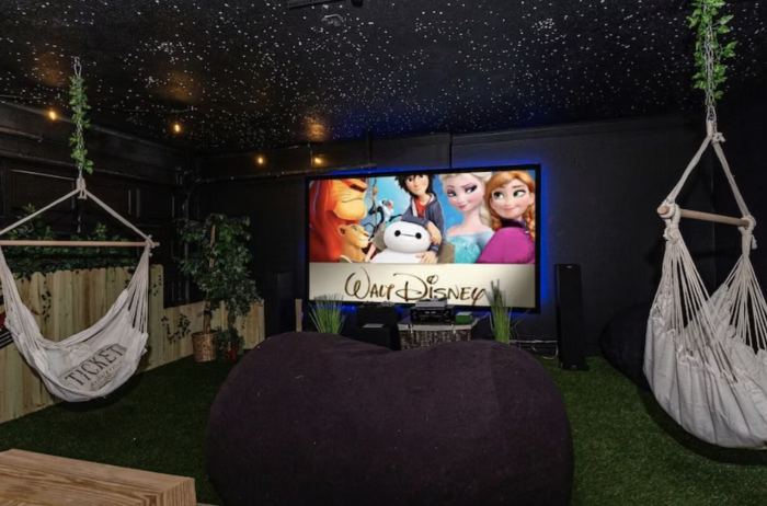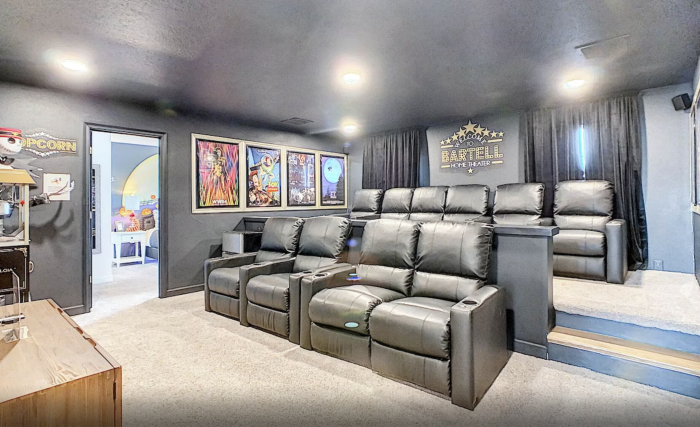But the real hit of the home is the 10-foot indoor theater. From the stars on the ceiling to the turf floor, you’ll think you’re having a movie night outside. It comes with two hammocks and a large bean bag chair. This would be the perfect place to come home from the parks to relax.