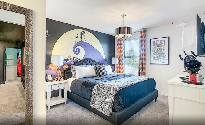 Finally, each bedroom is themed. You’ll see rooms inspired by Alice in Wonderland, Aladdin, and Nightmare Before Christmas. Between the 7 bedrooms, it can sleep 19 people.