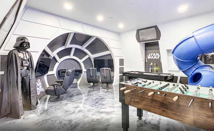 This “Extraordinary Disney Themed Home” is a 7 bedroom, 6 bathroom home just 15 minutes from Disney World. It includes an outdoor pool, game room, and movie theater. This would be great for large groups traveling together. First, this Star Wars game room is the perfect place to hang out in. It even comes with Darth Vader himself! Not to mention the slide, games, and gaming systems.