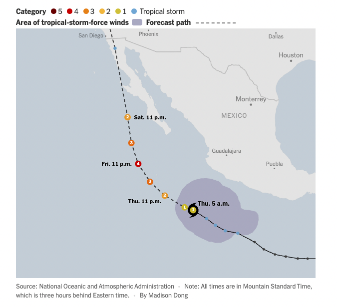The New York Times shows the expected intensification of the storm — from a category 1 to a category 4 and then back down. It appears that by the time it is projected to be closer to San Diego, however, it is anticipated that it’ll only be a tropical storm.