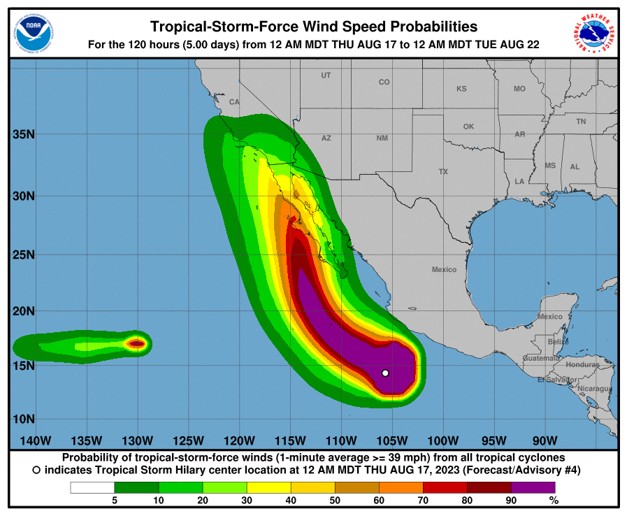 According to their updates from 3AM MDT on August 17th, 2023, the Hurricane Center has warned that Hilary “has the potential to bring significant impacts to the Baja California Peninsula and portions of the southwestern United States this weekend and early next week.”