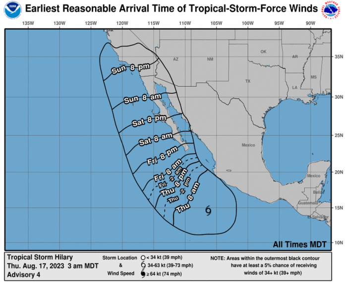 Here’s a timetable showing the arrival time of tropical storm-force winds. It looks like that could be closer to Sunday at 8PM MDT for areas of Southern California.