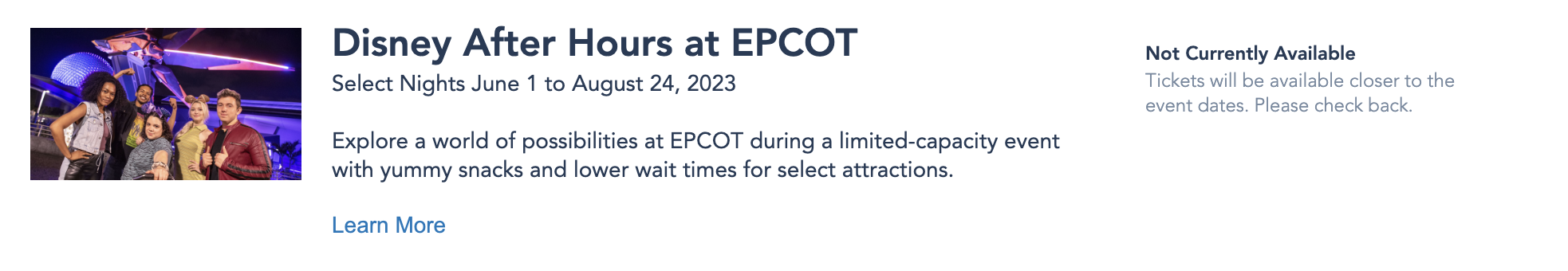 However, if you were hoping to attend an EPCOT After Hours event through August 24th, if you haven’t yet bought a ticket, you will no longer be able to do so. Every event is officially sold out through that date. If you visit the Disney World website to buy tickets, you’ll see that the event is now listed as “Not currently available.”