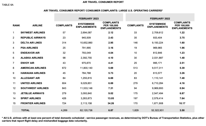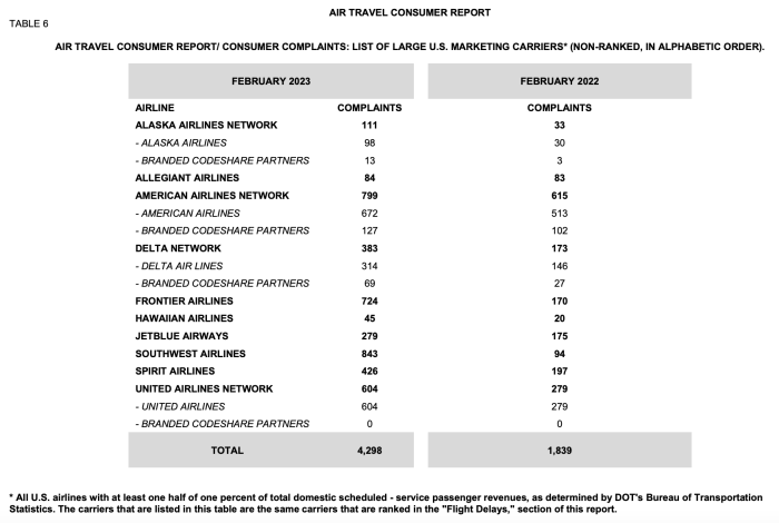 One of the most interesting stats displayed was the number of customer complaints that U.S. airlines received as a whole. In February 2022, the total number of complaints was 1,889. In February 2023, however, the total was much higher: 4,405. That means that that the number of customer complaints more than DOUBLED over the last year.