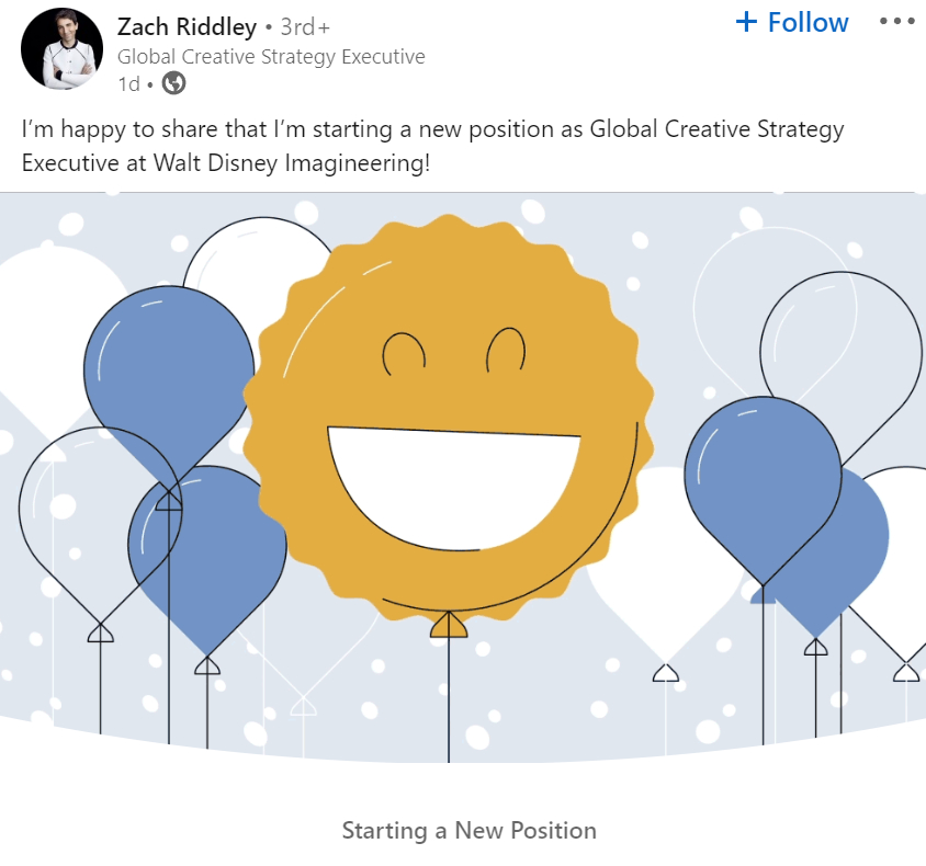 Disney Imagineer Zach Riddley has been promoted to Global Creative Strategy Executive at Walt Disney Imagineering, according to his Instagram bio and LinkedIn profile.