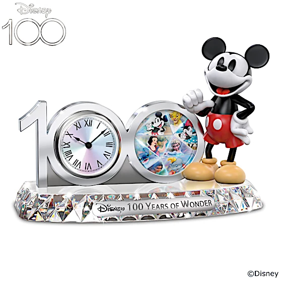 This limited-edition clock features a giant 100 with Mickey Mouse and has a faceted crystallized base. The “100” on the statue features the clockface itself, as well as a montage of classic Disney characters.