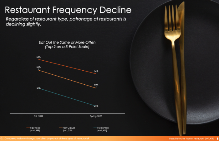 Compared to the fall of 2022, you can see how things are changing. They asked whether folks were eating out the same or more often at restaurants compared to 6 months ago, and there’s been a DECLINE in all 3 restaurant types.