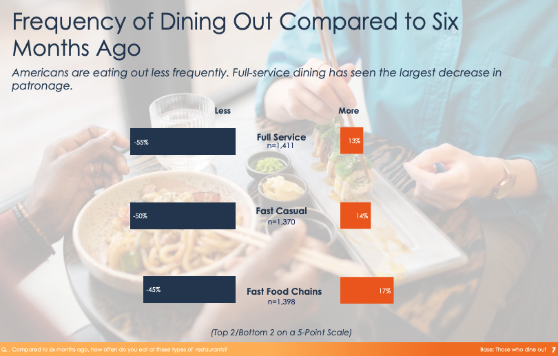 If you look at where people said they were eating out at MORE compared to 6 months ago, full service restaurants were only at 13% and fast casual restaurants were at 14%. Fast food chains, however, had the largest number at 17%.