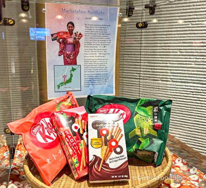 Look at this cute little assortment of Japanese snacks! It looks like there are a couple different types of Kit-Kats and a snack called Toppo. In the back, there’s a little “Marketplace Spotlight” with information about these snacks and why it is that they’re being showcased.