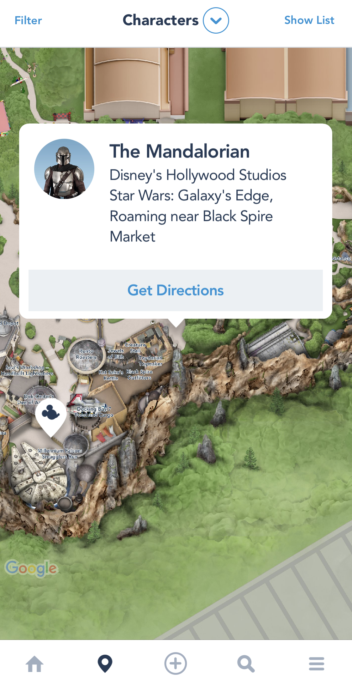 The Mandalorian character experience is marked by a Mickey head close to the Marketplace area.