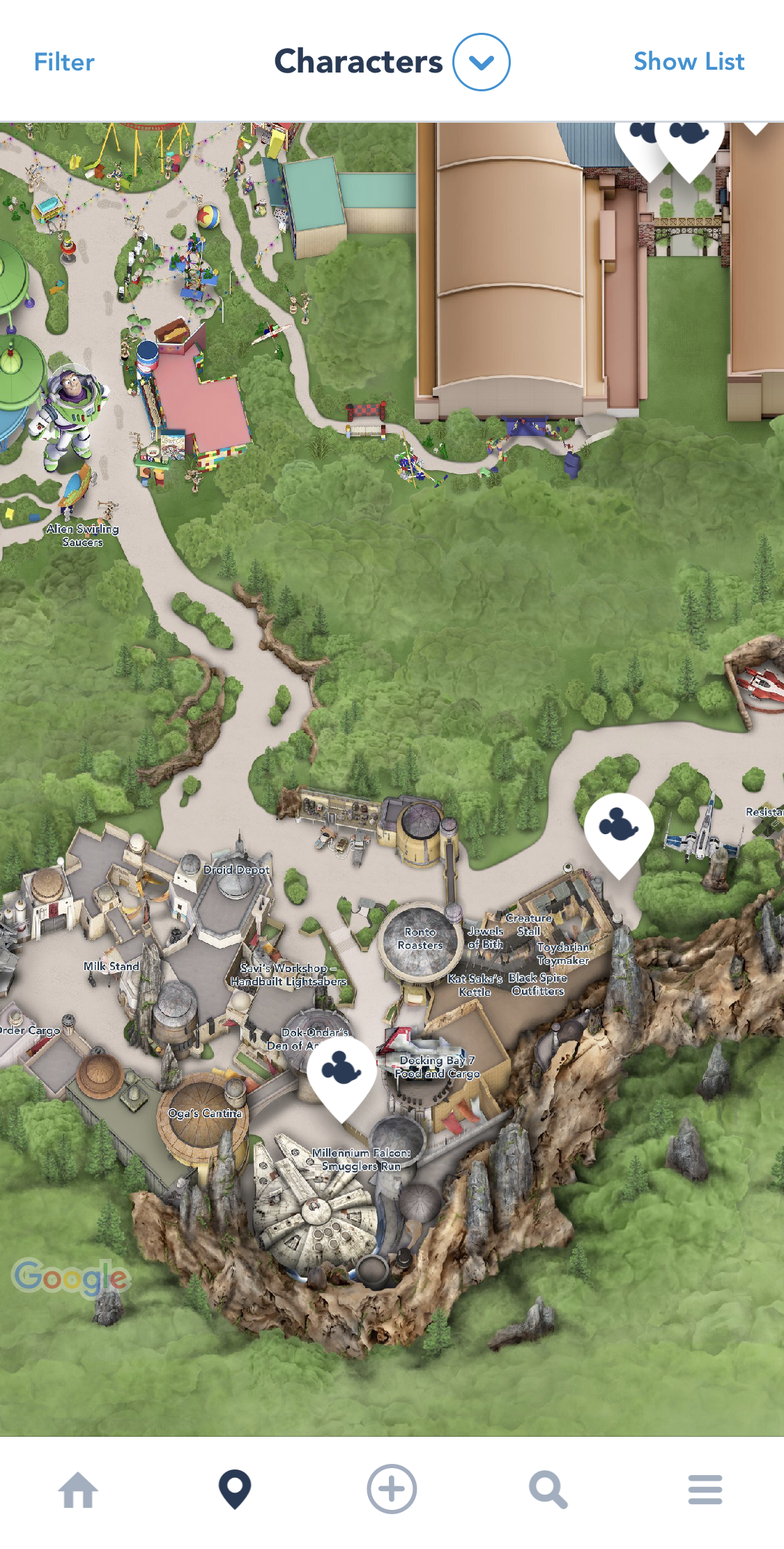 To find this, head to the map portion of the app (the second icon on the bottom) and make sure the filter (center, top) is set to characters. Then, take a look at the Galaxy’s Edge area.