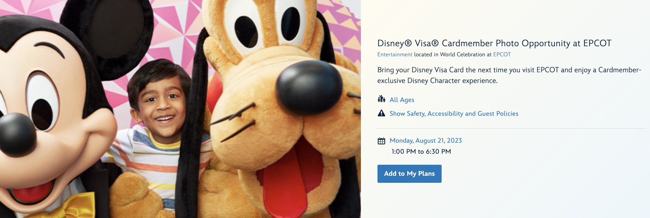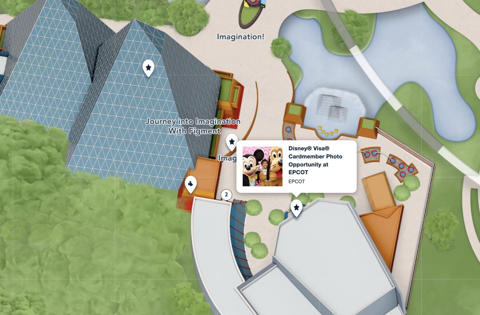 Over at EPCOT, you’ll find a Disney Visa-exclusive character meet-and-greet spot near the Journey into Imagination pavilion. What you’ll want to do is walk to the left-hand side of the pavilion (if you’re facing it) — past the Disney and Pixar Short Film Festival.