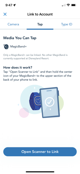 From there, you can either scan the MagicBand+ with your phone, scan the barcode with your camera, or type in the ID that you can find on the back of your MagicBand+.