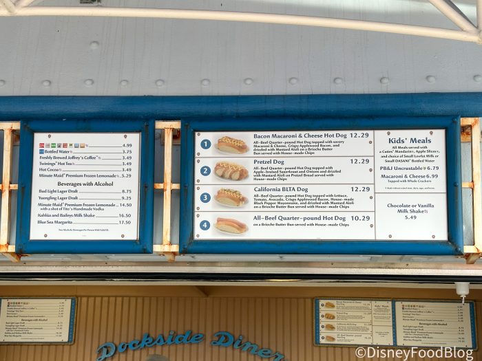 Dockside Diner’s menu mainly consists of quirky hot dog variations, a few side items, and, on occasion, seasonal treats or desserts like a few you’ll probably catch in this review. You’ll want to be sure to check the menu, as these dessert offerings change frequently. For this review, we tried to keep it as casual as possible on a hot summer day with hot dogs and a milkshake!