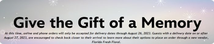 Back in June, Disney announced that starting August 27th these floral and gift operations will be transitioned to a third-party service — Florida Fresh Floral. The Floral and Gifts website confirms this and notes that for now, online and phone orders are only accepted for delivery dates through August 26th, 2023.