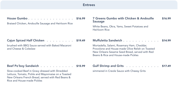 The Entrees range from $14.99 for a Muffuletta Sandwich to $19.49 for the Cajun Spiced Half Chicken.