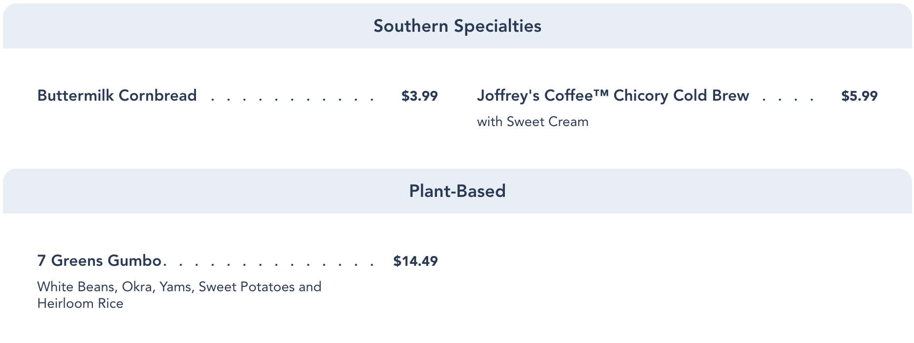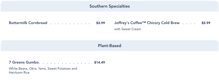 There are also some Southern Specialties, like the Buttermilk Cornbread for $3.99 and the Joffrey’s Coffee Chicory Cold Brew for $5.99. If you’re looking for something plant-based, the 7 Greens Gumbo is $14.49.