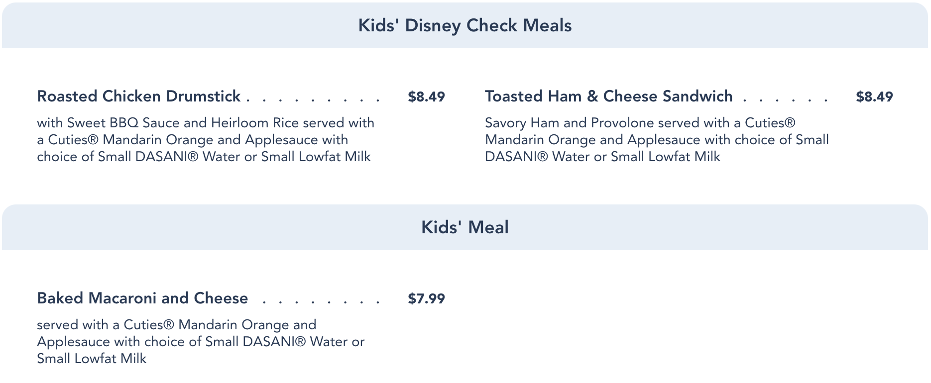 Lastly, the Kids’ Meals cost $8.49, and you can choose between the Roasted Chicken Drumstick or the Toasted Ham and Cheese Sandwich.