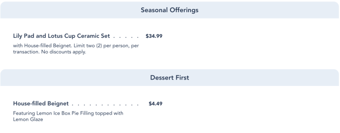 First up, this new quick-service spot has a Seasonal Offering — the Lily Pad and Lotus Cup Ceramic Set for $34.99. You’ll also notice the desserts are listed first! You’ll be able to get House-filled Beignets for $4.49.