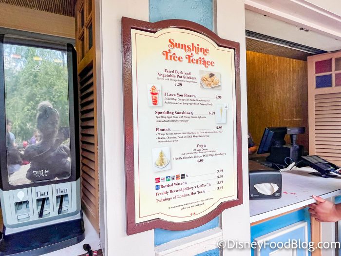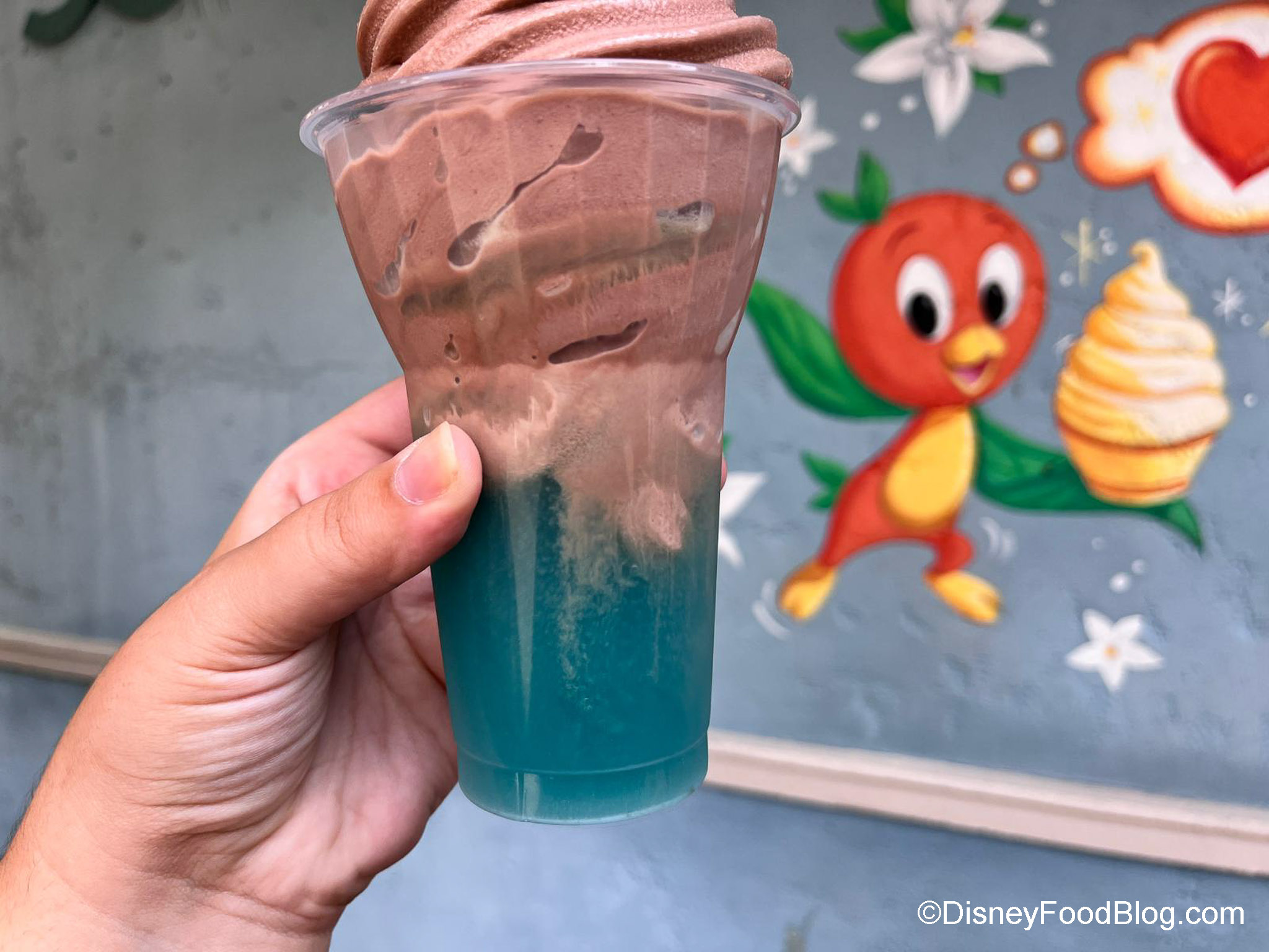 At Sunshine Tree Terrace, you can get a float with a variety of beverages, including Barq’s Root Beer, Coca-Cola, Fanta Orange soda, Fanta Strawberry soda, Powerade Mountain Berry Blast, or Sprite, served with your choice of Dole Whip or soft serve. Now, to make it an official float, you can pair any of those drinks with vanilla, chocolate, Dole Whip Orange, Citrus Swirl, Orange Cream, or Dole Whip Strawberry soft serve.
