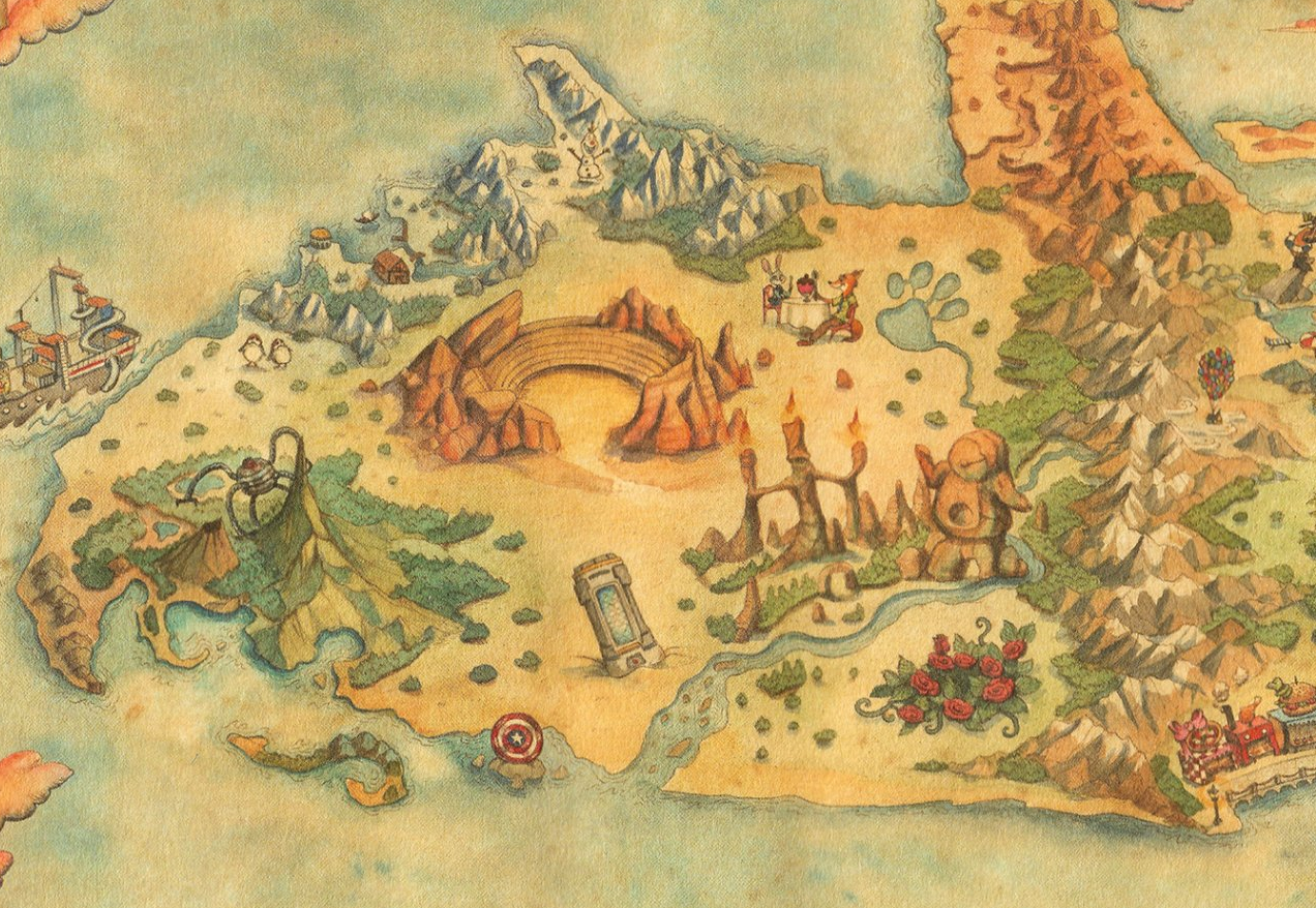 Let’s take a look at the left side of the map. At the top, we see Olaf hanging around a Frozen area — will the Disney Treasure have a dining experience like the Frozen one on the Disney Wish? Underneath that, we see Judy Hopps and Nick Wilde enjoying some ice cream, which could suggest a Zootopia-themed ice cream spot on the new ship. Captain America’s shield is at the bottom near a Quantum core, which could be a hint that there will be a Marvel-themed experience onboard.