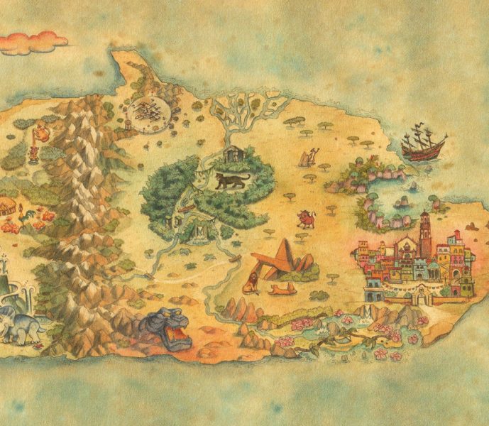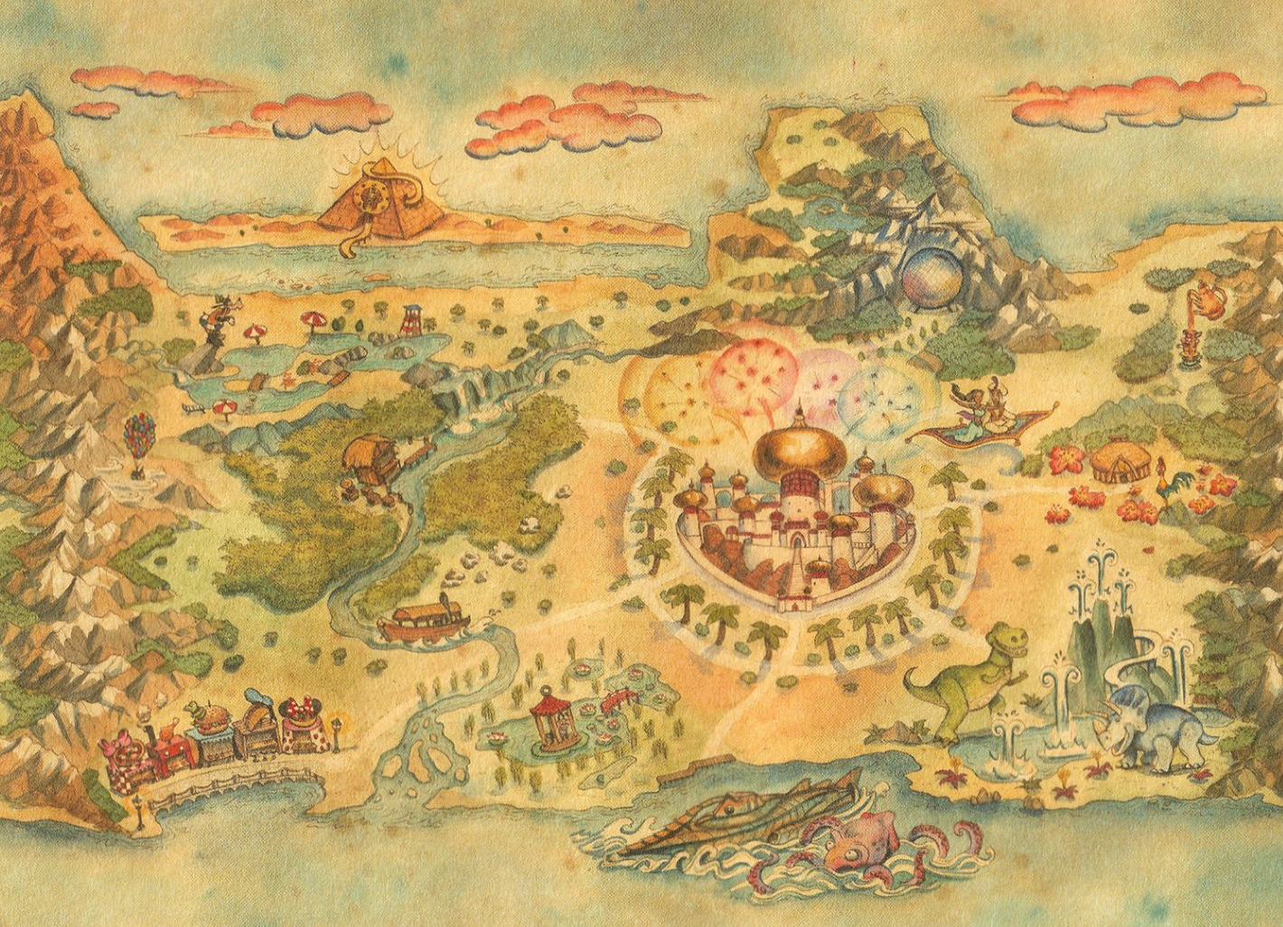 In the center of this part of the map, we see the Palace of Agrabah, which will serve as inspiration for the ship’s Grand Hall. Jasmine and Aladdin are on a flying carpet nearby. Then there’s Spaceship Earth in front of a mountain range. We’ll be honest — we have NO idea what that means. To the left of the palace is a series of huts and a river with a Jungle Cruise ship on it.