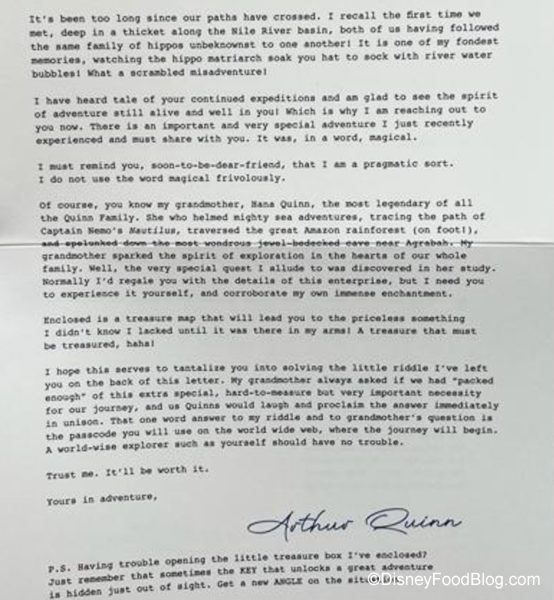 The letter is from an adventurer named Arthur Quinn. We wonder…is he part of the Society of Explorers and Adventurers? Our letter also offers a very important hint, along with a story of a “scrambled misadventure.”