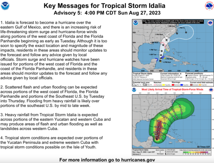 UPDATE: As of the Monday, August 28th, 4AM CT advisory, Idalia is forecast to become a major hurricane before reaching Florida’s Gulf Coast. Storm surge and hurricane watches are in effect for parts of the West Coast.