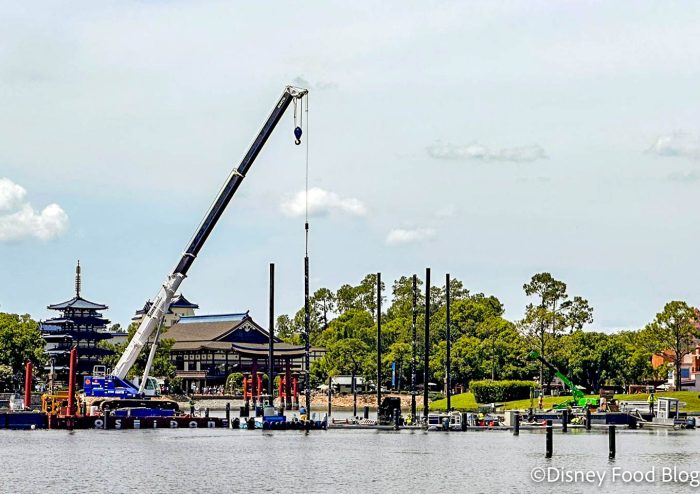 So we’ve been seeing these new additions in World Showcase Lagoon lately, and we think they might be there for the NEW EPCOT nighttime show that’s coming soon to celebrate the Walt Disney Company’s 100th Anniversary.