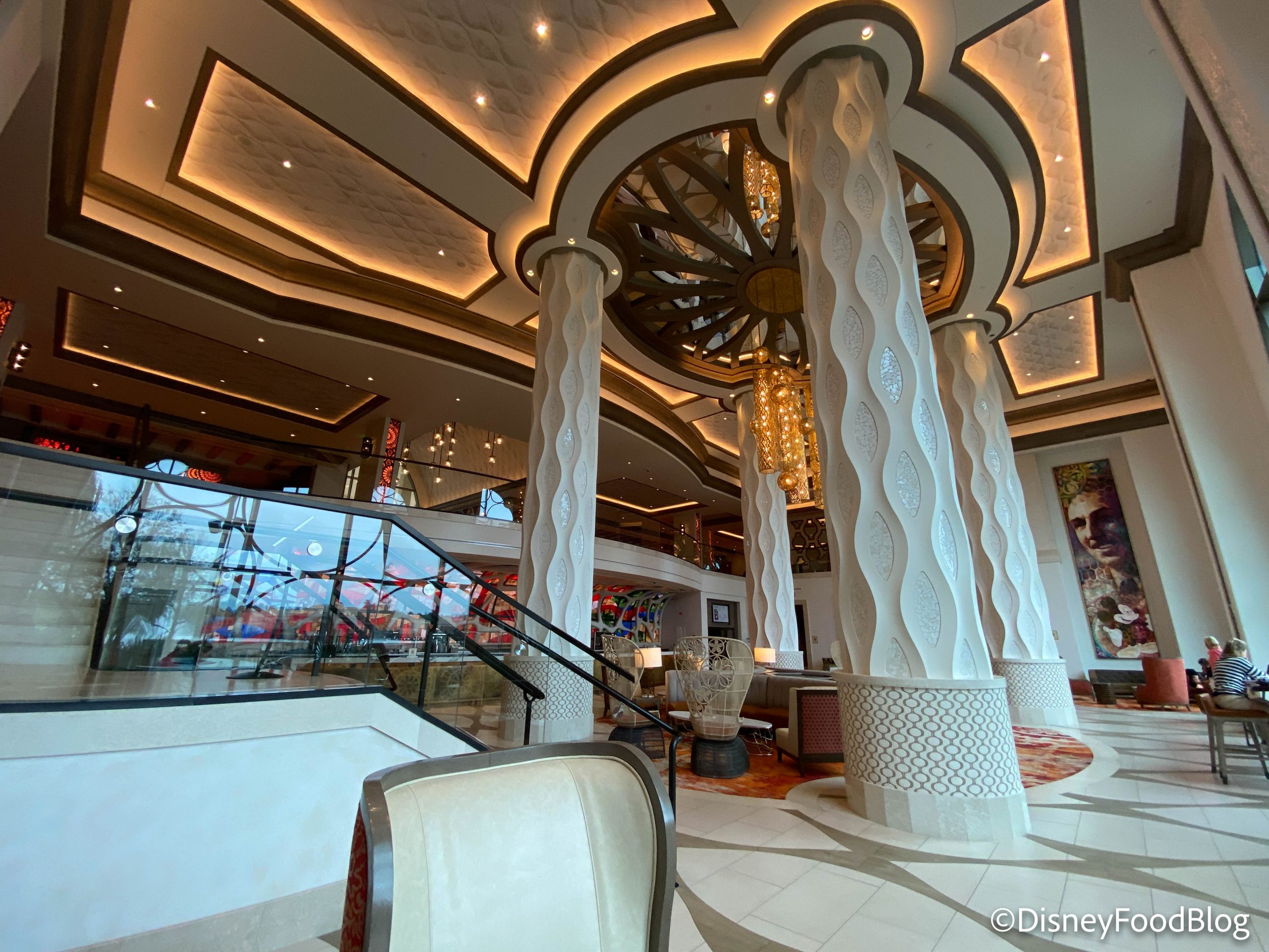 Saratoga Springs isn’t the ONLY resort where you can ACTUALLY relax and unwind on Disney property. In fact, if you book a room inside Disney’s Gran Destino Tower — over at Coronado Springs — you can get a luxurious hotel experience at a much more moderate price point. When you first walk into the Gran Destino lobby, you’re going to be greeted by ART. Art… EVERYWHERE. From the scaling ceiling, to the intricate, decorative Spanish backdrops, to the marble accents, to the dripping light fixtures. ART. ALL OF IT.