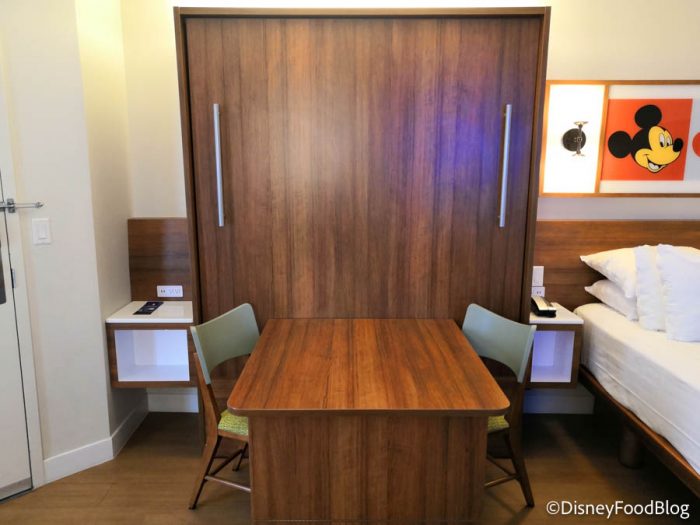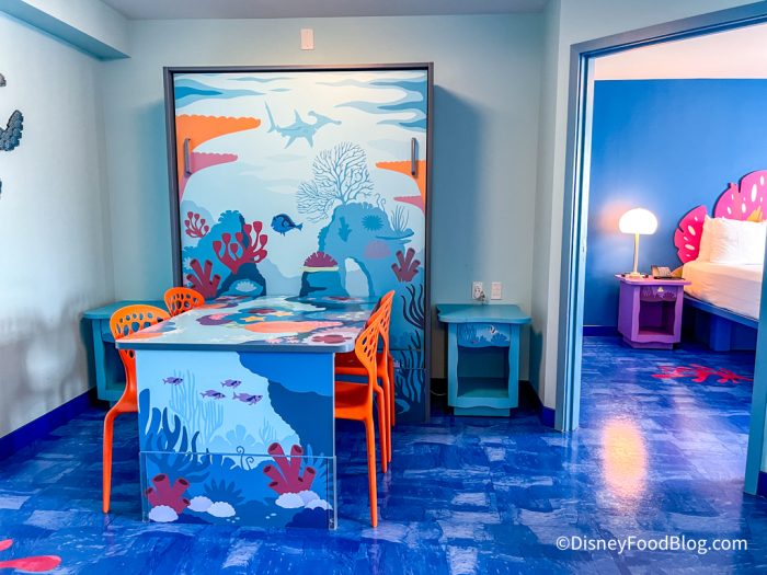 There is a standard room option, themed around The Little Mermaid, but — again — you’re looking at one of the most EXPENSIVE standard room options across the value resorts (with prices that usually sit around $250+ per night). Not only that, but the two queen beds that you’ll find in these rooms take up SO MUCH SPACE all trip long. (Meanwhile, if you stay in one of the recently-renovated value resort rooms at Pop Century or All Star Movies, you’ll have the ability to fold one of those beds up into the wall to transform it into table space during the day (if you need somewhere to eat a quick breakfast or play a card game in the evenings).