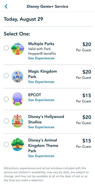 You can purchase Genie+ through the My Disney Experience app on the day you’re visiting the parks. The service grants you access to Lightning Lane selections so you can skip the lines at certain rides.