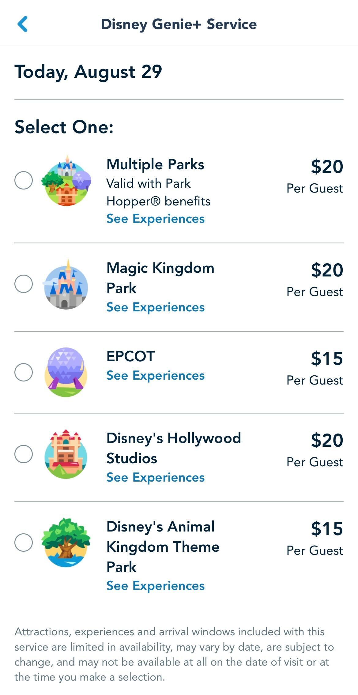 But this morning when we checked the price of Genie+, the Multiple Parks option and Magic Kingdom were down to $20 and EPCOT and Animal Kingdom were just $15!