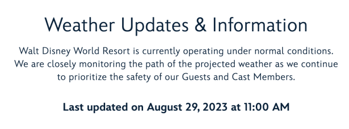 As of 11AM on August 29th, the Disney World website states, “Walt Disney World Resort is currently operating under normal conditions. We are closely monitoring the path of the projected weather as we continue to prioritize the safety of our Guests and Cast Members.”