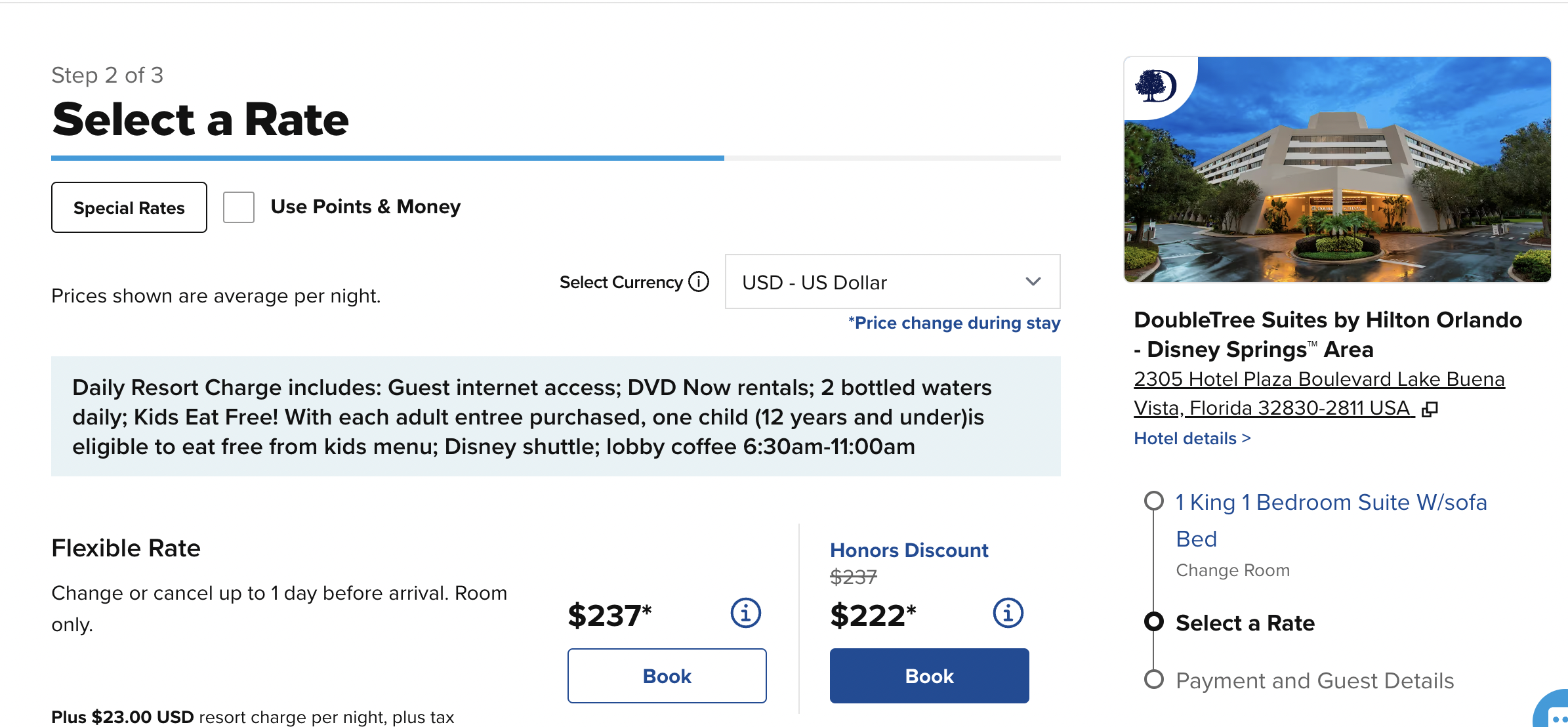 For example, for these same dates, you can book a 1 king 1-bedroom suite with a sofa bed (which has a separate king bedroom and living room) at the DoubleTree Suites by Hilton Orlando in the Disney Springs Area for $237 (or even less if you have the Honors Discount).