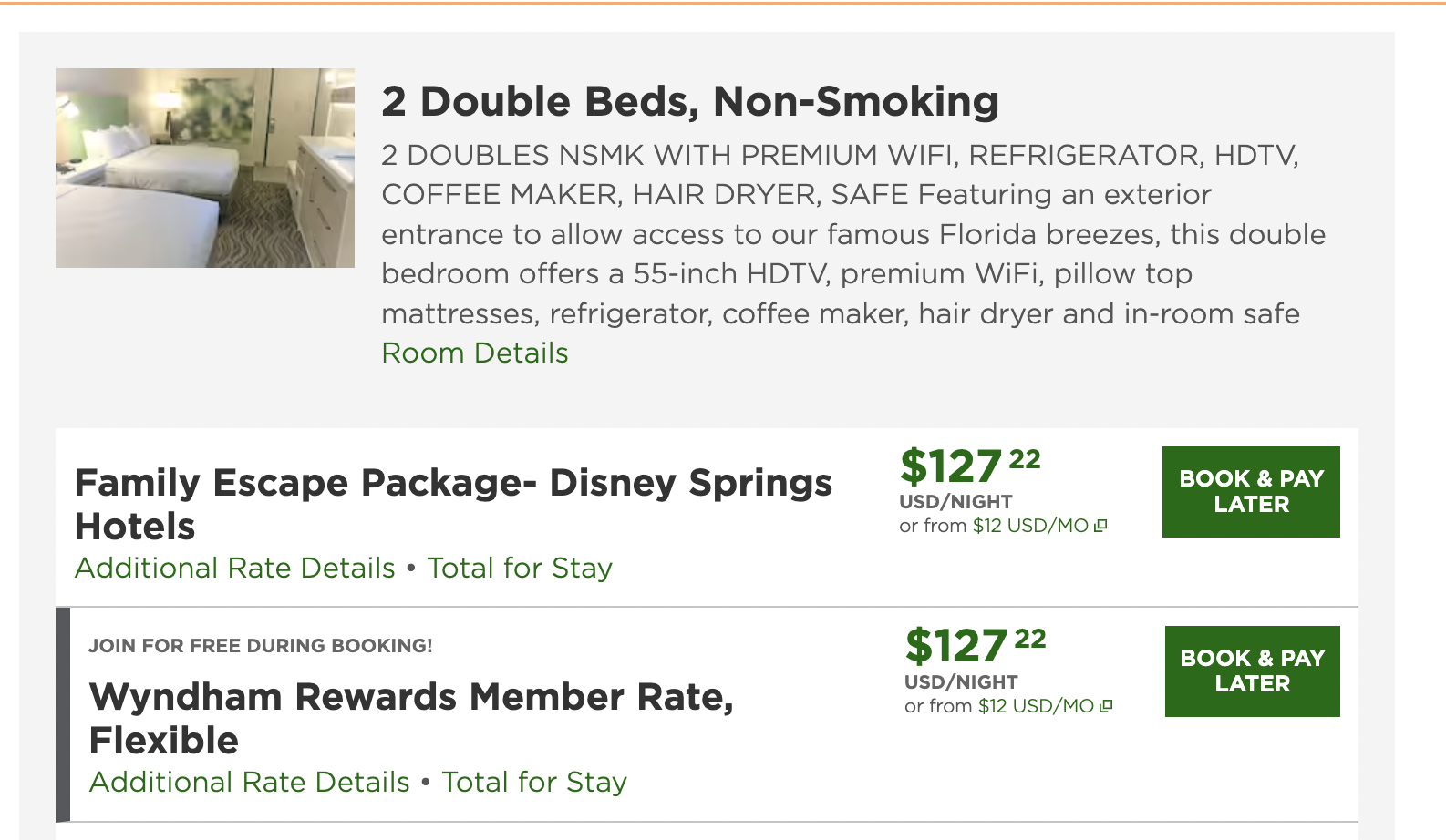 Opt for a place like the Wyndham Garden Lake Buena Vista (another Disney Springs hotel) and you could book a room with 2 double beds for $127.22 per night (though keep in mind there is a resort fee to add onto that).