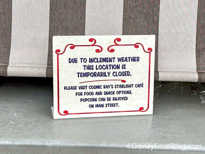 Throughout the day, we noticed that some of the outdoor dining locations remained closed. In Fantasyland, the Storybook Circus Popcorn and Pretzel Carts were closed due to inclement weather.