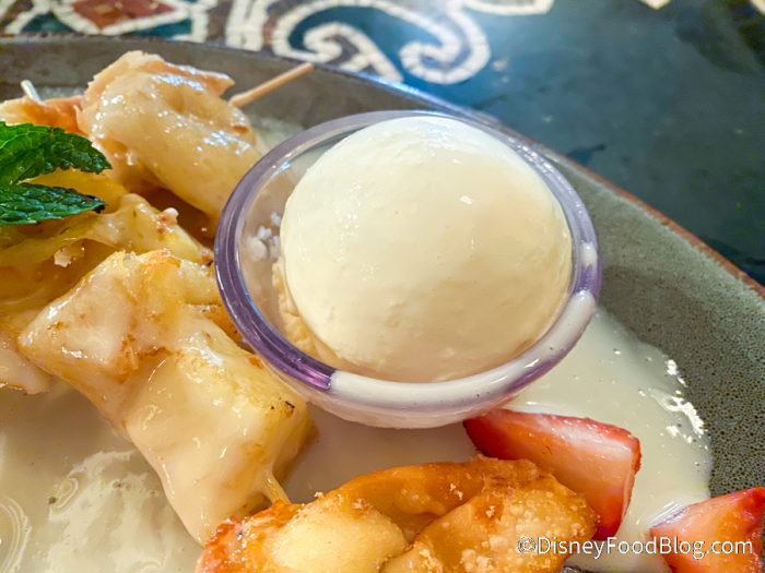 On to dessert at Yak and Yeti! You cannot go wrong with the dessert-style fried wontons. They are filled with cream cheese and served with skewered pineapples, vanilla ice cream, and honey-vanilla drizzle. They’re mouth-watering. At $13.49, we recommend saving room for this dessert!