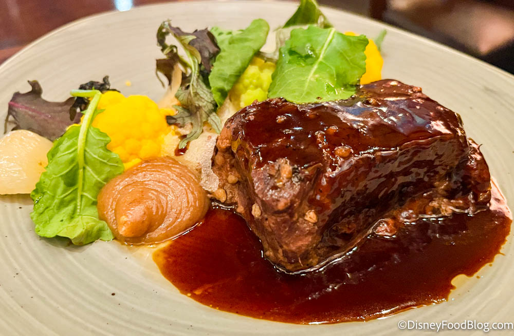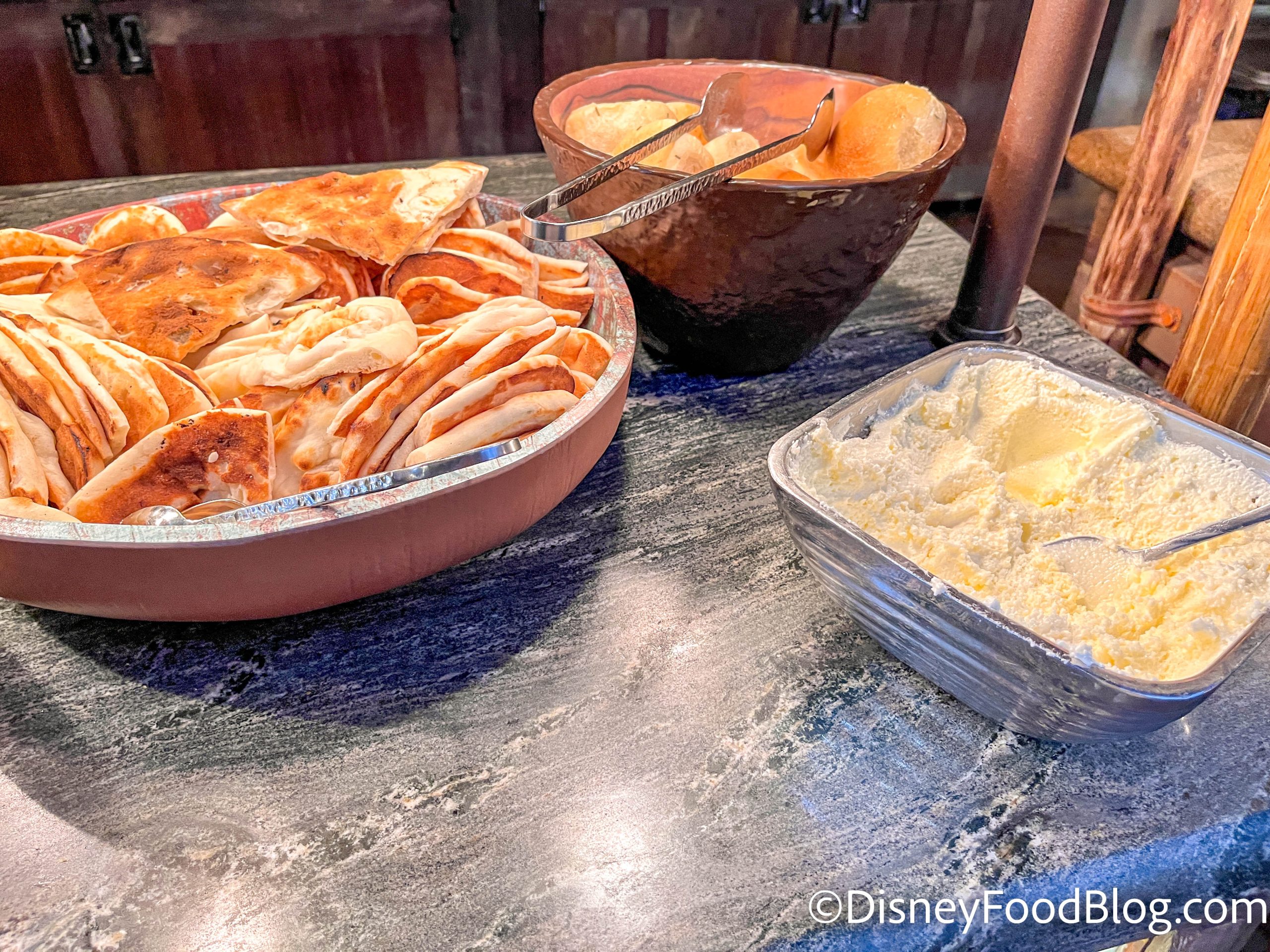If you go to Tiffins you HAVE to get the Signature Bread Service for your appetizer. It’s so good. It comes with Thai Red Curry Milk Bread and Pão de Queijo and several sauces for dipping or spreading on the bread. The sauces are Coconut-Curry Sauce, Guava Sauce, and Ginger-Pear Chutney. The bread service at Sanaa at Animal Kingdom Lodge is probably a bit better, but this is seriously a close second!